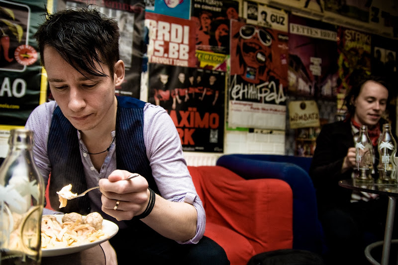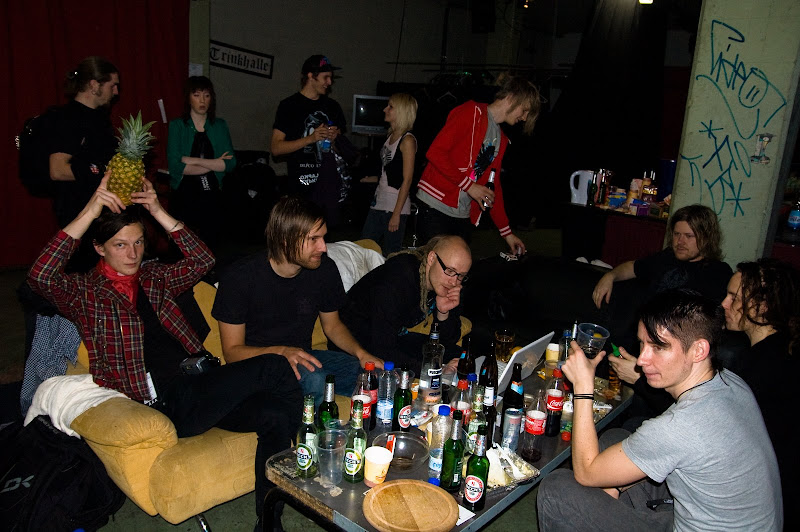 In some classy venues they have warm in-house dinners, which are usually excellent and almost always have something with spinach. Spinach is great! Spätzli is also amazing, I think that’s spätzli on Jussi’s plate. It’s these thick noodles made out of wheat and potato, like pasta but better. This tour’s other great culinary experiences were the quorni we had I´n Gothenburg and the heavenly veggie burger we had in Graz, Austria. Tears still roll down the cheeks when I think about that tasty motherfucker.