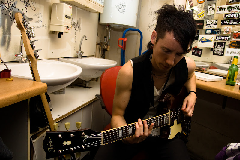 Jussi, preparing before a show. He streches his fingers with this super fast arpeggio thing before every show, trickling up and down the neck. It sounds like a soundtrack from a weird psycholigical thriller, maybe in a scene where some madman eats a spider and stares into the camera. Too bad you can’t get it as a ringtone.