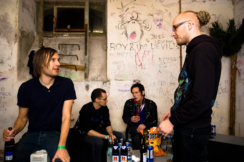 A tour blog without a live picture is pretty weird, so here you go! Jussi shreds and Joni is...warming his hands in the fire? Photo by Heikkonen.