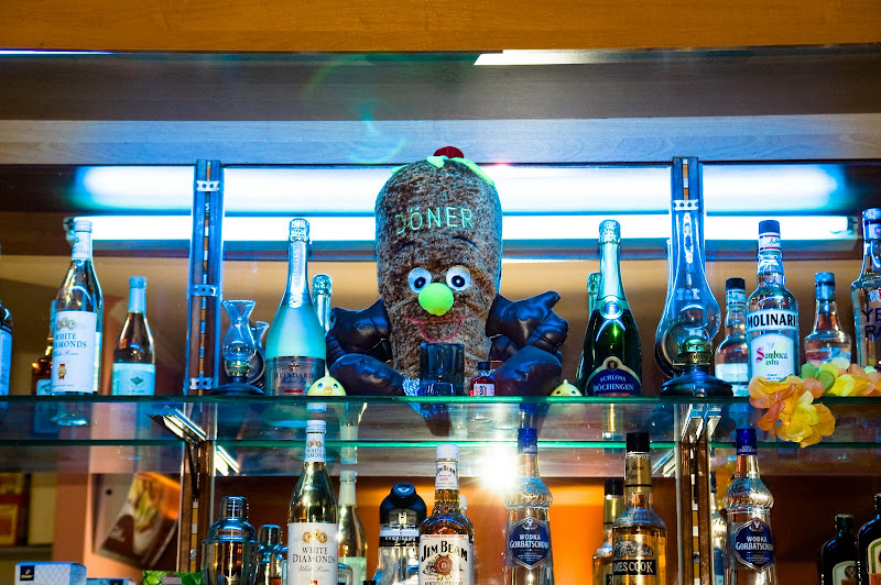 Döner-Dude in Hamburg. He’s so contempt up there, like a king! But, leather gloves and boots?